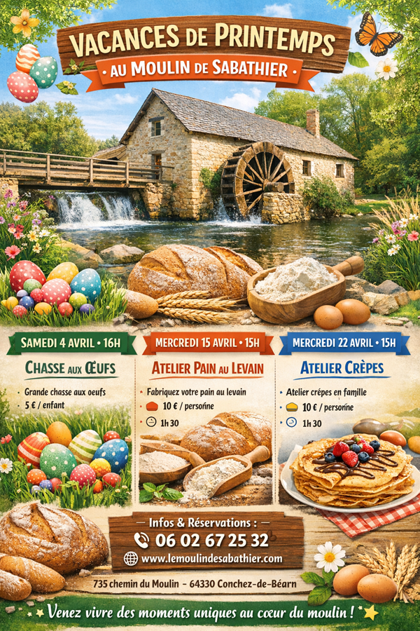 mercredi 15 avril : 15h : atelier fabrication de pain . Durée 1h30 avec visite du Moulin / tarif : 10 € / personne. Tarif identique enfant / adulte . Gratuit pour les - de 3 ans
